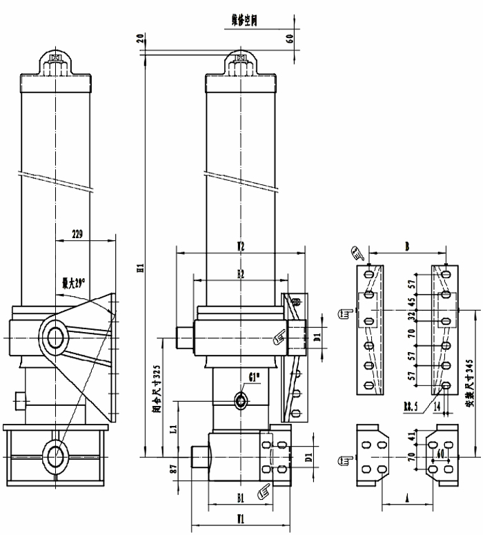 | B1/W1 | 265/405 | 215 | D1有 60/ L1 有160/ H1為液壓缸封閉尺寸,對照上表具體型號。 所有安裝螺栓及自鎖螺母的規格為M16。 墊圈規格為φ17× 支座與液壓缸之間的最大間隙為 鎖緊支座螺栓后,焊接定位板。 |